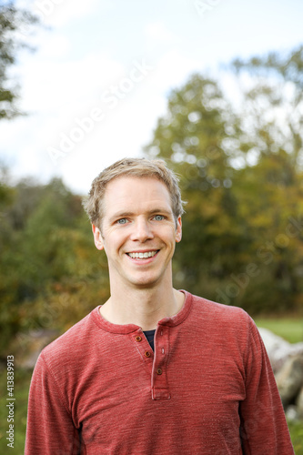 portrait of a man standing and smiling in fall wearing casual shirt