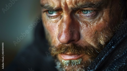 man, portrait, intense, blue, eye, facial hair, beard, moustache, wrinkle, skin, texture, closeup, head shot, photo, people