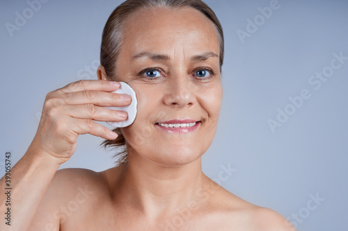 Portrait of a mature woman with bare shoulders using a cotton pad. Facial skin care concept.