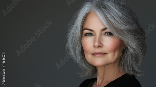 Portrait of a mature woman with gray hair in a studio setting, elegant and confident