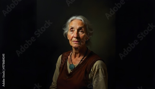 portrait, mature woman, grey hair, woman, elderly, pensive, thoughtful, expression, necklace, dark background, closeup, face, calm, serene, elegant, dignified, wisdom, age, lifestyle, candid, real people, authentic