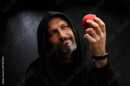 Portrait of a pensive bald man with a beard in a black hood with a red Christmas ball on a dirty gray background. Concept of young santa.