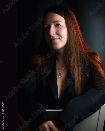 Portrait of a pretty girl with red hair, dressed in a black jacket. Portrait of a model in the Studio on a dark background.