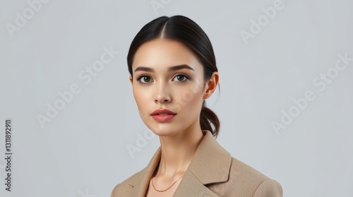 portrait, woman, elegant, blazer, neutral, studio, refined, beauty, fashion, style, professional, modern, simple, chic, attractive, graceful, serene, poised, confident, businesswoman, executive, entrepreneur, leader, minimalist, aesthetic, clear, looking, forward, presentation, communication, corporate, design, marketing, advertisement, isolated, clean, skincare, make-up, fresh, concept