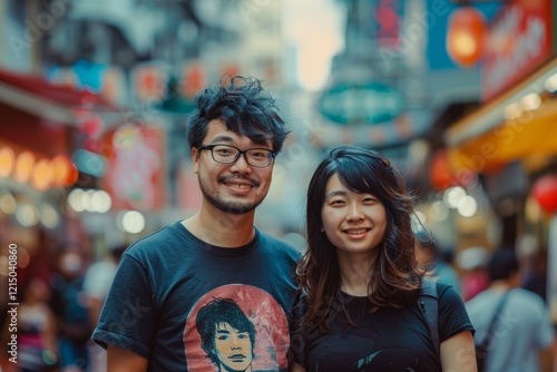 Portrait of a satisfied asian couple in their 30s sporting a vintage band t-shirt in busy urban street