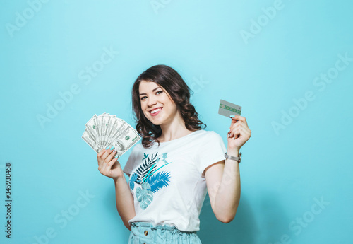Portrait of a satisfied beautiful Asian girl holding money banknotes and credit card isolated over blue background