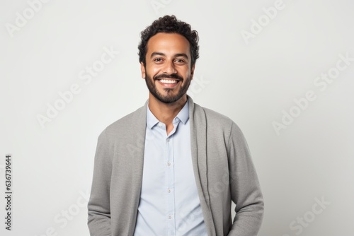 Portrait of a Saudi Arabian man in his 30s in a white background wearing a chic cardigan