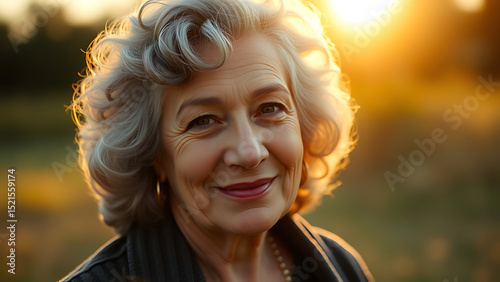 Portrait of a serene senior woman with gray curly hair outdoors at golden hour smiling gently and lo