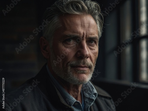 Portrait of a serious mature man with grey hair and beard, standing by a window in a dimly lit room, conveying a contemplative mood.