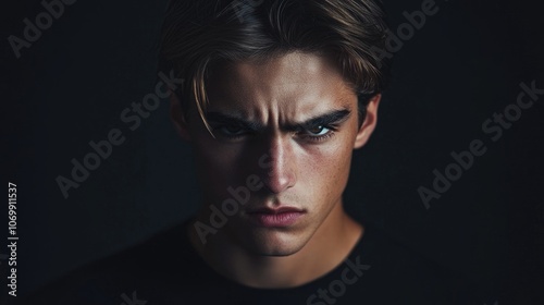 Portrait of a serious young man captured in a dark setting, emphasizing his intense expression. Ideal for designs needing a serious young man theme with ample copy space.