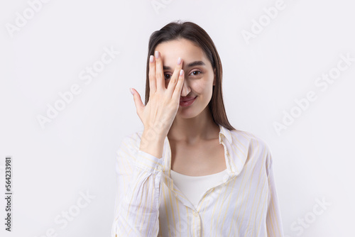 Portrait of a serious young woman showing stop gesture with her palm over white background