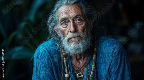 portrait of a sixty year old ugly hippie dressed casually in white linen