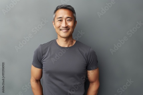 Portrait of a smiling asian man in his 40s donning a trendy cropped top over minimalist or empty room background