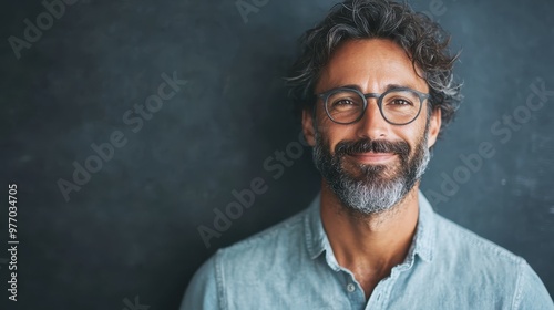 man, portrait, smiling, beard, warmth, dreamlike, relaxation, friendly, joy, calm, welcoming, modern, engaging, approachable, charming, casual attire, stylish, contemporary, urban, sophisticated, cultured, charisma, personable, upbeat, inviting, dynamic, open, vibrant, lively, spirited, fashionable, harmony, positive, optimism, joyful, sociable