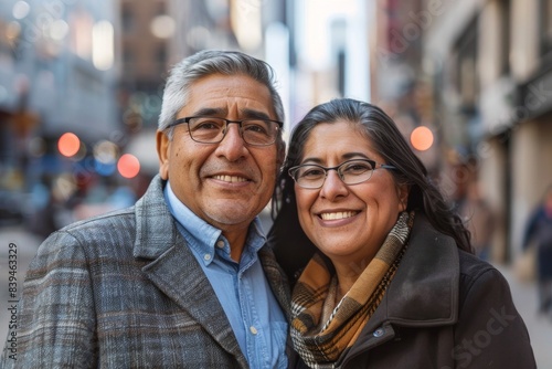 Portrait of a smiling latino couple in their 50s wearing a professional suit jacket over busy urban street
