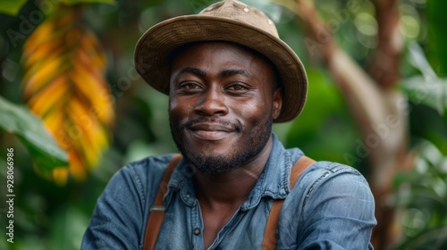 portrait, man, hat, smile, nature, green, outdoors, closeup, casual attire, denim, shirt, suspenders, foliage, natural, relaxed, happy, confident, friendly, tropical, background, person, face, expression, lifestyle, fashion, jungle, leaf, summer, sunlight, day, male