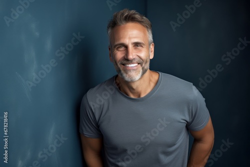 Portrait of a smiling man in his 50s dressed in a casual t-shirt against a bare monochromatic room. AI Generation