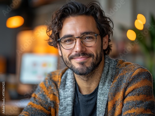 business, technology, background, bokeh, confident, lifestyle, casual attire, goggles, eye, comfortable, diversity, man, friendly, contemporary, relaxed, blurred, atmosphere, happy, office, light, success, modern, cardigan, hair, professional, entrepreneur, indoor, startup, positive, portrait