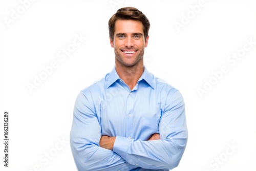 man, smiling, blue shirt, white background, portrait, adult, male, happy, business, confidence, photogenic, caucasian, shirt, isolated, success, professional, businessman, people, young, person, style, modern, attractive, executive, smart, looking, 1, positive, arms crossed, model, stylish, collar, fashion, upper body, brunette, well-dressed, clean