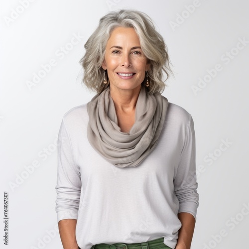 mature woman, smiling, stylish, fashion, lifestyle, portrait, grey hair, elegant, happy, confidence, beauty, middle-aged, casual clothes, foulard, positivity, grace, simplicity, natural makeup, skincare, wellness, health, femininity, charme, fashion model, poised, approachable, cheerful, content, comfortable, serene, dignified, fashion industry, advertising, role model, authentic, real people, inspirational, joy, optimistic