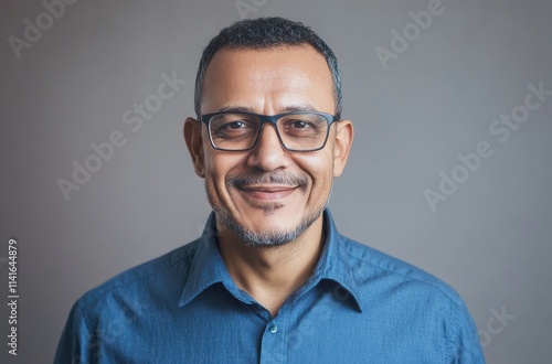 Portrait of a smiling middle-aged man with glasses, wearing a blue shirt against a neutral grey background, exuding confidence and approachability in professional and personal contexts.