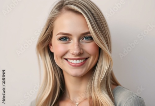 Portrait of a smiling Nordic blond female with a warm and inviting expression