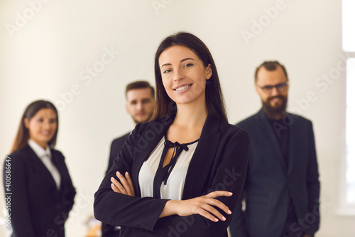 Portrait of a smiling pretty young business woman on the background of employees.