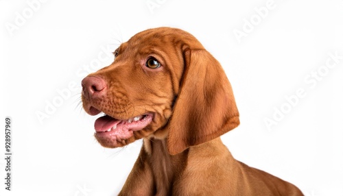 笑顔のショートヘアード・ハンガリアン・ビズラの子犬のポートレート(Portrait of a smiling Shorthaired Hungarian Vizsla puppy on white background)