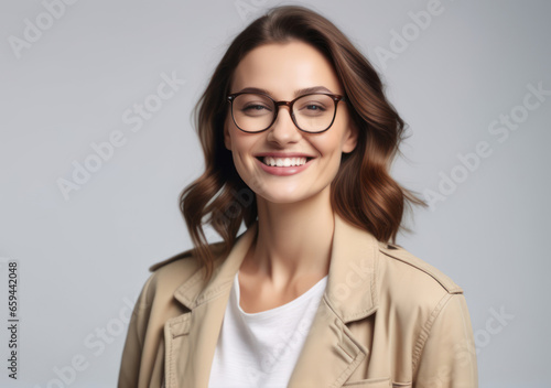 woman, goggles, business, businesswoman, people, beauty, person, smile, smiling, face, 1, eyeglass, looking, suit, brunette, lady, student, model, office, closeup, professional, work, studio, cheerful, teacher