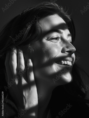 woman, smiling, black-and-white, portrait, closeup, happiness, one person, adult, female, joy, shadow, light, emotion, hand, face, indoor, beauty, expressive, photo, half face