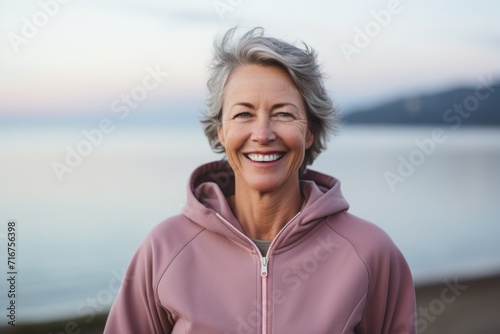 Portrait of a smiling woman in her 50s wearing a zip-up fleece hoodie against a calm bay background. AI Generation