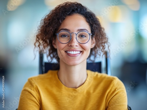 woman, portrait, smiling, goggles, curly hair, businesswoman, confidence, professional, happy, cheerful, young, adult, female, office, corporate, head shot, person, face, optimistic, brunette, eyeglass, smart, beautiful, indoor, one person