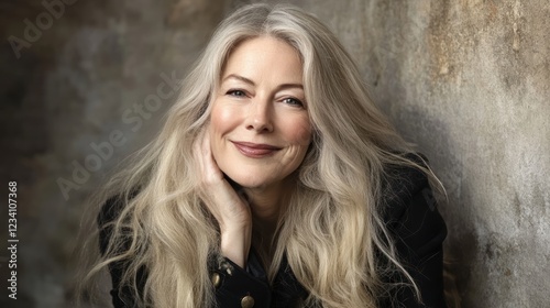 woman, portrait, hair, blond, smile, model, beauty, fashion, style, elegant, attractive, pretty, gorgeous, charming, graceful, lady, female, girl, person, human, face, expression, happy, joyful, content, serene, calm, relaxed, peaceful, studio, photo, photo, image, picture, indoor, background, grey, wall, texture, older, mature