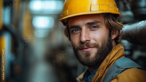 Portrait of a smiling worker in a hard hat looking at the camera against a blurred background.