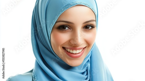 Portrait of a Smiling Young Woman in a Light Blue Hijab Against a White Background