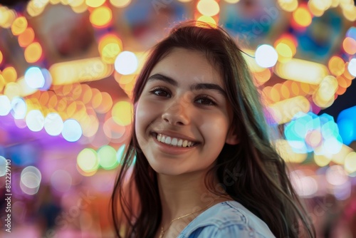Portrait of a smiling young woman with bokeh carnival lights illuminating the scene, capturing a moment of happiness