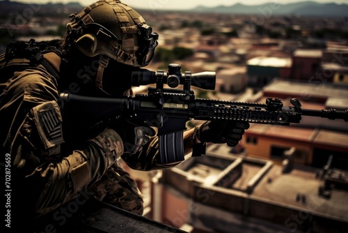 Portrait of a special forces soldier with assault rifle on the background of the city, AI Generated