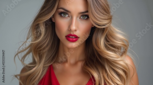 Portrait of a striking woman with blonde hair and vibrant red lips, wearing a red dress. The image captures elegance and sophistication against a subtle gray background.
