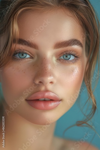 Portrait of a stunning young woman with flawless skin, showcasing natural nude makeup and gently caressing her face. Embodying spa, skincare, and wellness in a close-up shot with copyspace.