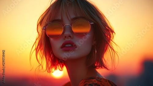 Portrait of a stylish woman in round sunglasses, bathed in the warm glow of the setting sun. Ethereal beauty with a vintage vibe.