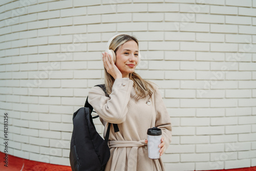 Portrait of a teenage girl student smile and listen to music on wireless headphones
