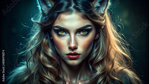 Portrait of a werewolf woman with elegant hair and glamorous makeup in a black studio setting, showcasing beauty and style