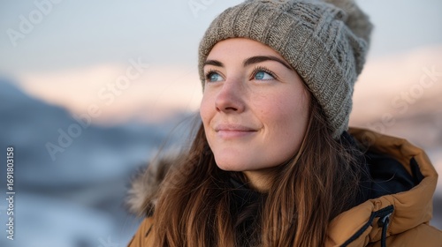 Portrait of a woman enjoying the view of snow-capped mountains at sunset.