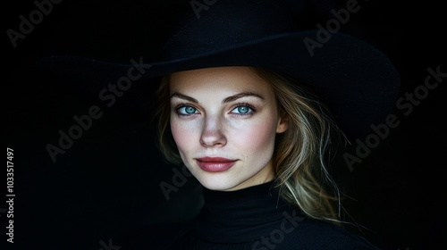 Portrait of a woman in a black hat, elegant expression, dark background, showcasing beauty and confidence.