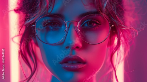 Portrait of a woman in glasses illuminated by vibrant neon lights, showcasing modern fashion and futuristic aesthetic.