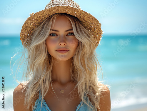woman, hat, beach, summer, beauty, bikini, vacation, sea, sun, people, sky, water, holiday, fashion, model, smile, person, tan, hair, travel, swimwear, lifestyle, 1, face, blond