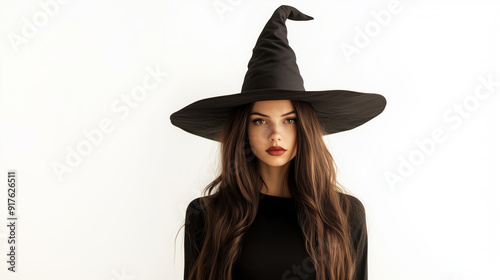 Portrait of a woman wearing a black witch hat and dark outfit, with long brown hair, minimalist Halloween costume