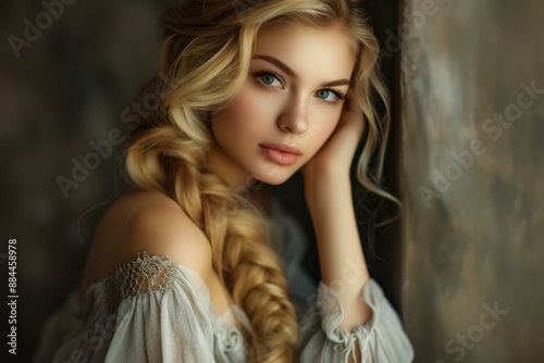 woman, portrait, braid, coiffure, beauty, elegant, eye, captivating, serene, feminine, young, fashion, hair, pretty, attractive, blond, model, style, make-up, glance, gaze, expression, peaceful, charming, grace, trendy, chic, natural, vintage, romantic, soft, allure, elegance, sophistication, styled, close, up, female, youth, calm, poise, delicate, classic, timeless, stylish, photogenic, studio, shot