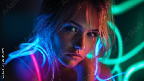 woman, portrait, blonde hair, neon light, dark, moody, atmosphere, face, beauty, female, girl, model, person, light, blue, green, pink, glow, illuminated, artistic, creative, style, fashion, closeup, expression, indoor, studio, modern, aesthetic, vibrant