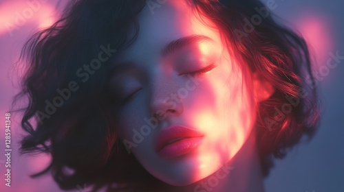 portrait, woman, face, eye, closed, lip, red, pink, light, shadow, skin, beauty, serene, calm, peaceful, artistic, soft, dreamy, subtile, elegant, gentle, dark, hair, short, wave, blue, magenta, colours, sharpened, close, aesthetic, smooth, make-up, glow, highlight, expression, emotion, texture, detail, abstract, contrast